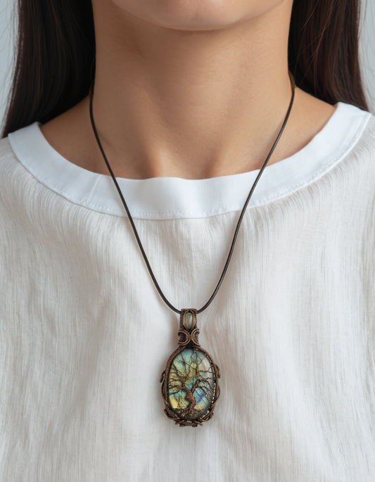 Handmade Oval Labradorite Necklace with Tree of Life